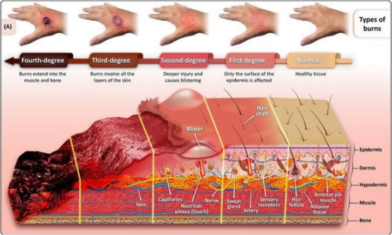 Burns, by definition, include the deterioration of skin tissue in response to its exposure to heat, electric current, intense sunlight, certain chemical agents, or ionizing radiations. The effect of burns on human health depends on their severity which ranges from minor to major. In some cases, burns can be severe enough to cause fatalities.