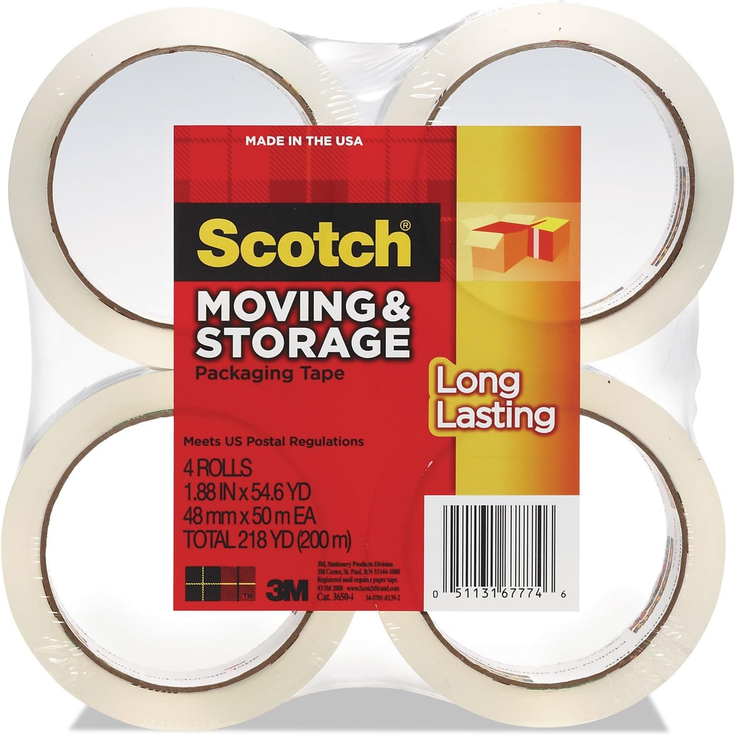 3M Moving and Storage Tape – Strong and Durable Sealing, 1.875 in x 54.6 yd, Clear, 4 per Pack