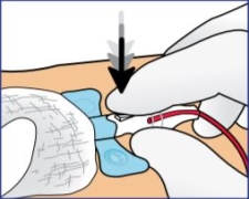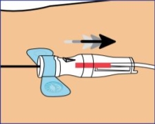 | 4.Proper access to the vein will be indicated by the presence of flash directly behind and below the button. |