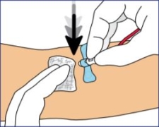 5a. The device is designed to be activated while the needle is still in the patients vein. Place your gauze pad or cotton ball on the venipuncture site. Allow gauze pad or cotton ball to cover nose of front barrel. Following the collection procedure, and while the needle is still in the vein, grasp the body with the thumb and middle finger. Activate the button with the tip of the index finger.
