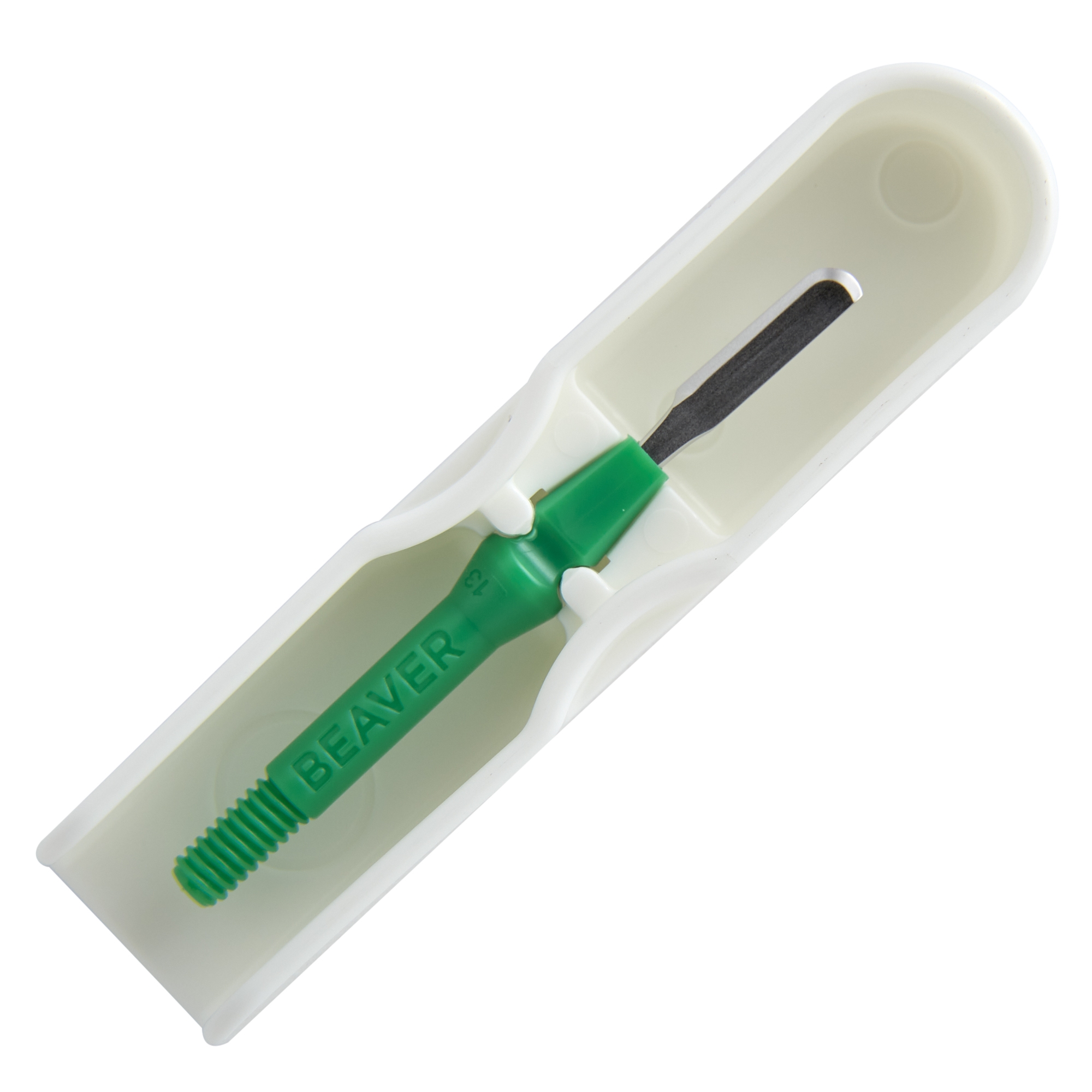 The Beaver Visitec EAVER6400 is a sterile 6400 Mini-Blade® with a round tip, sharp one side, green screw-on, grindless technology, 20/box.