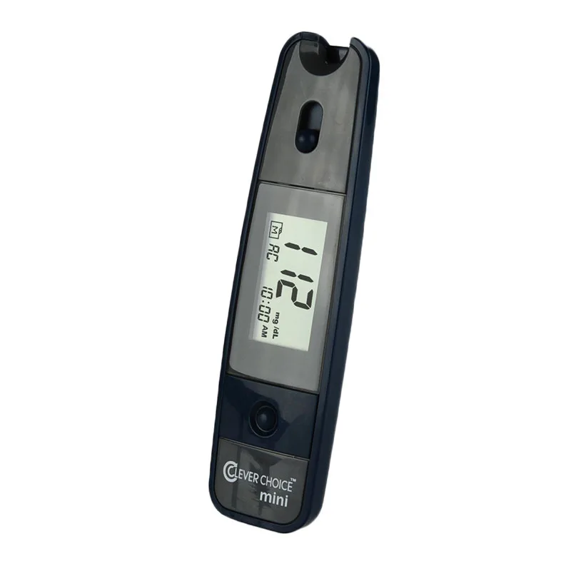 The Clever Choice Mini Meter Blue is a blood glucose meter used for self-testing blood sugar levels in people with diabetes.