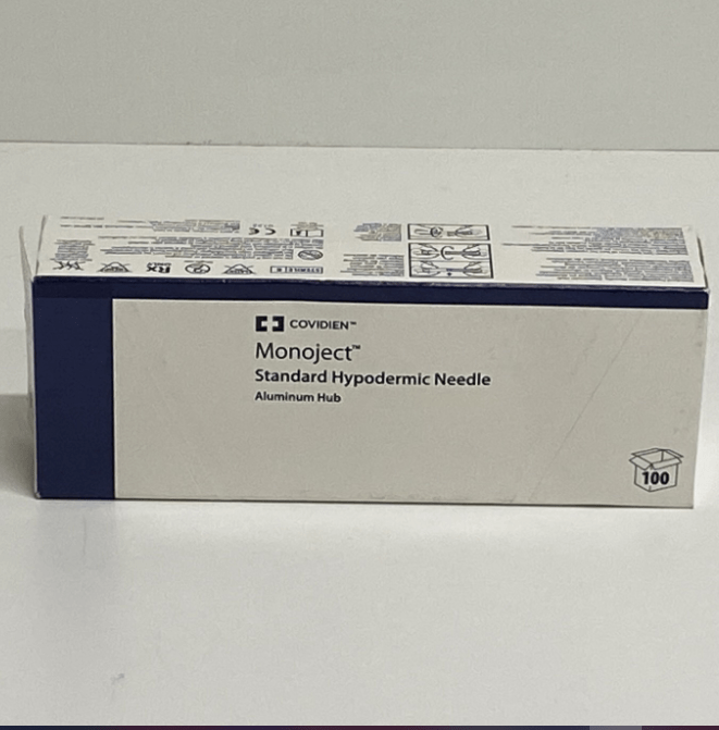 The Covidien Monoject Standard Hypodermic Needle (Box of 100) 8881200045 is a single-use, sterile needle designed for injecting medications or fluids subcutaneously (under the skin), intramuscularly (into muscle), or intradermally (into the dermis layer of the skin). It features a thin, sharp point for atraumatic insertion and a luer slip fitting for secure attachment to syringes.