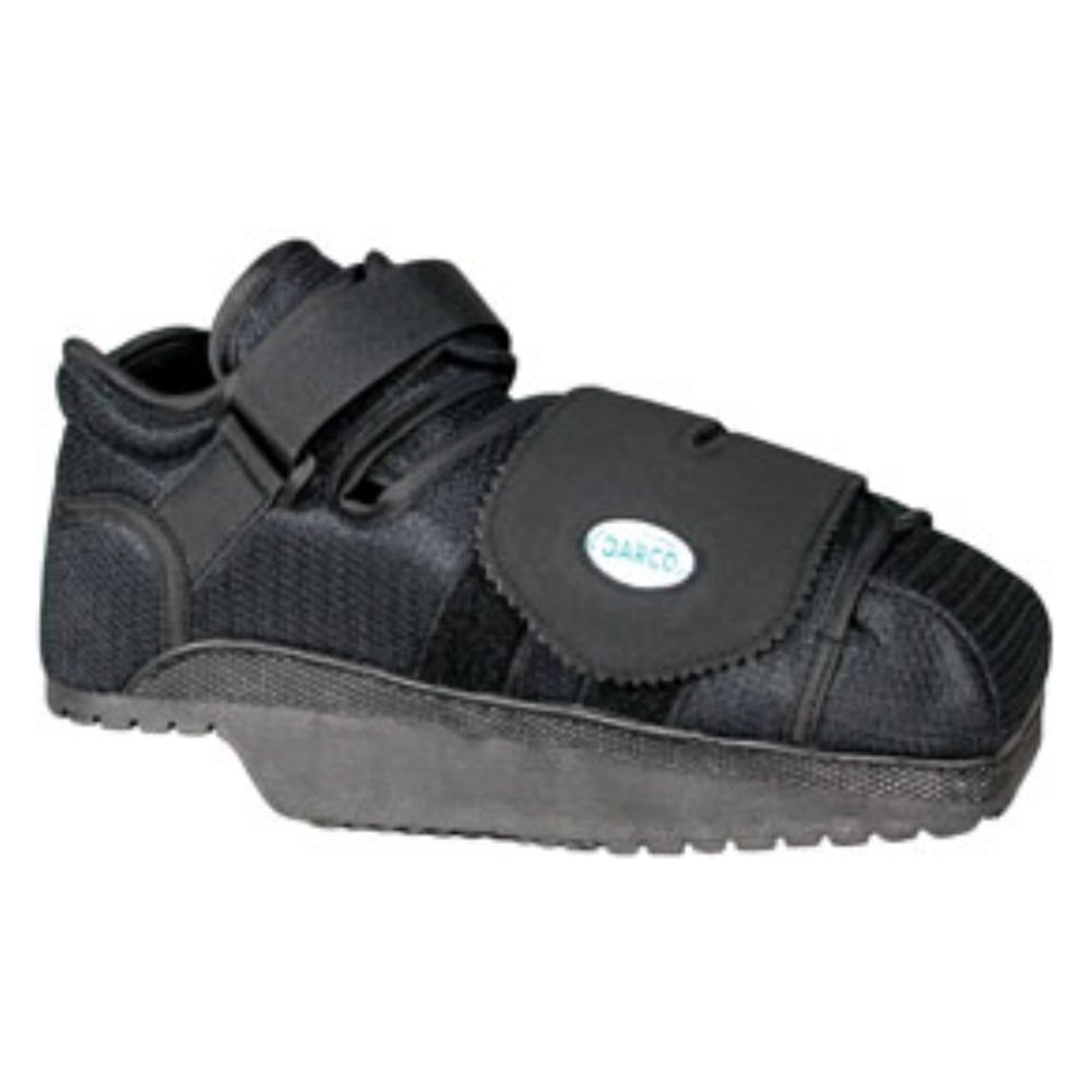 The DARCO HQ2B is a single (1) HeelWedge healing shoe in medium size and black color. This patented design is clinically proven to significantly reduce weight-bearing pressure on the heel, shifting it to the mid and forefoot to promote healing of plantar fasciitis, ulcerations, infections, trauma, and following surgery on the soft tissue or bony structure of the heel.