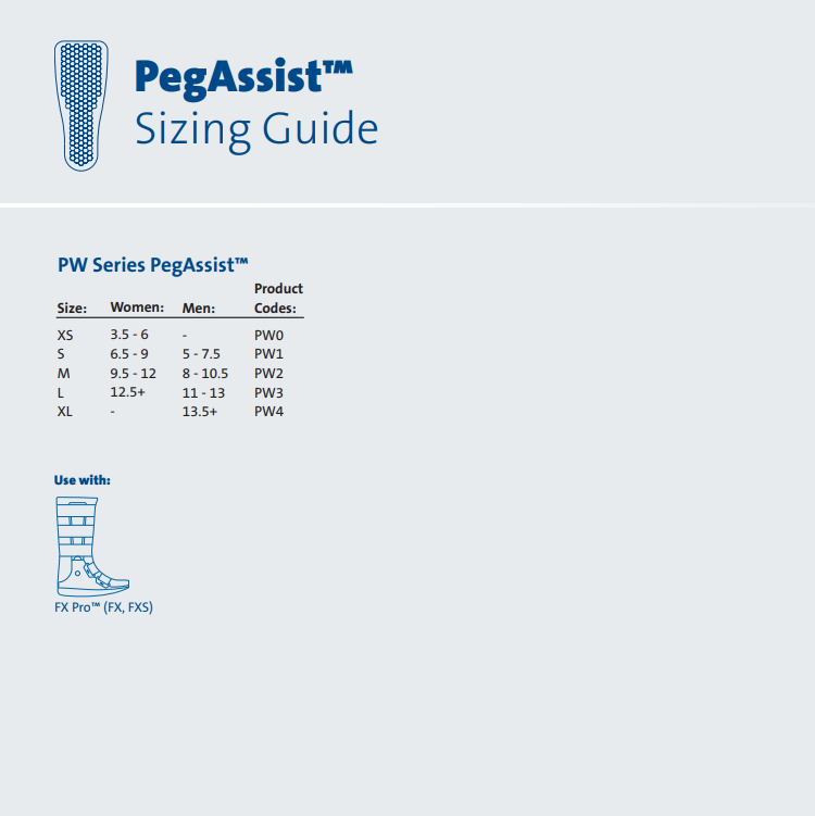 DARCO PW4 refers to the PEGASSIST WALKER INSOLE in an extra-large (XLARGE) size. It is sold individually (1/EA), with 12 units per box (12/BX) and 3 boxes per case (3BX/CA). This insole is part of the DARCO PegAssist Insole System, featuring a multi-indication removable-peg chassis designed to effectively offload pressure on the plantar aspect of the foot after surgery or when wounds are present. The PegAssist can reduce pressure by up to 60%, allowing the patient to remain ambulatory. This specific PW Series insole is designed to fit DARCO’s FX Pro Walker and other standard walkers, quickly converting them into effective off-loading devices. It has a 15mm combination Plastazote® and Multi-Foam base with a 3mm Poron® cover to provide cushioning and prevent ring edema and edge abrasion. A stabilizer board with a low-profile molded hook strip is included to adhere to the walker liner and prevent shifting during ambulation. This extra-large size is typically for men’s shoe sizes 13.5 and up.