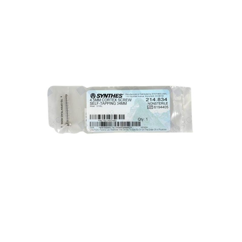Product Overview: The DEPUY SYNTHES 214.834 4.5MM Cortex Screw, measuring 34MM, is designed for optimal fixation in orthopedic applications. Crafted from high-quality stainless steel, this screw offers exceptional strength and durability, ensuring reliable performance in surgical procedures.