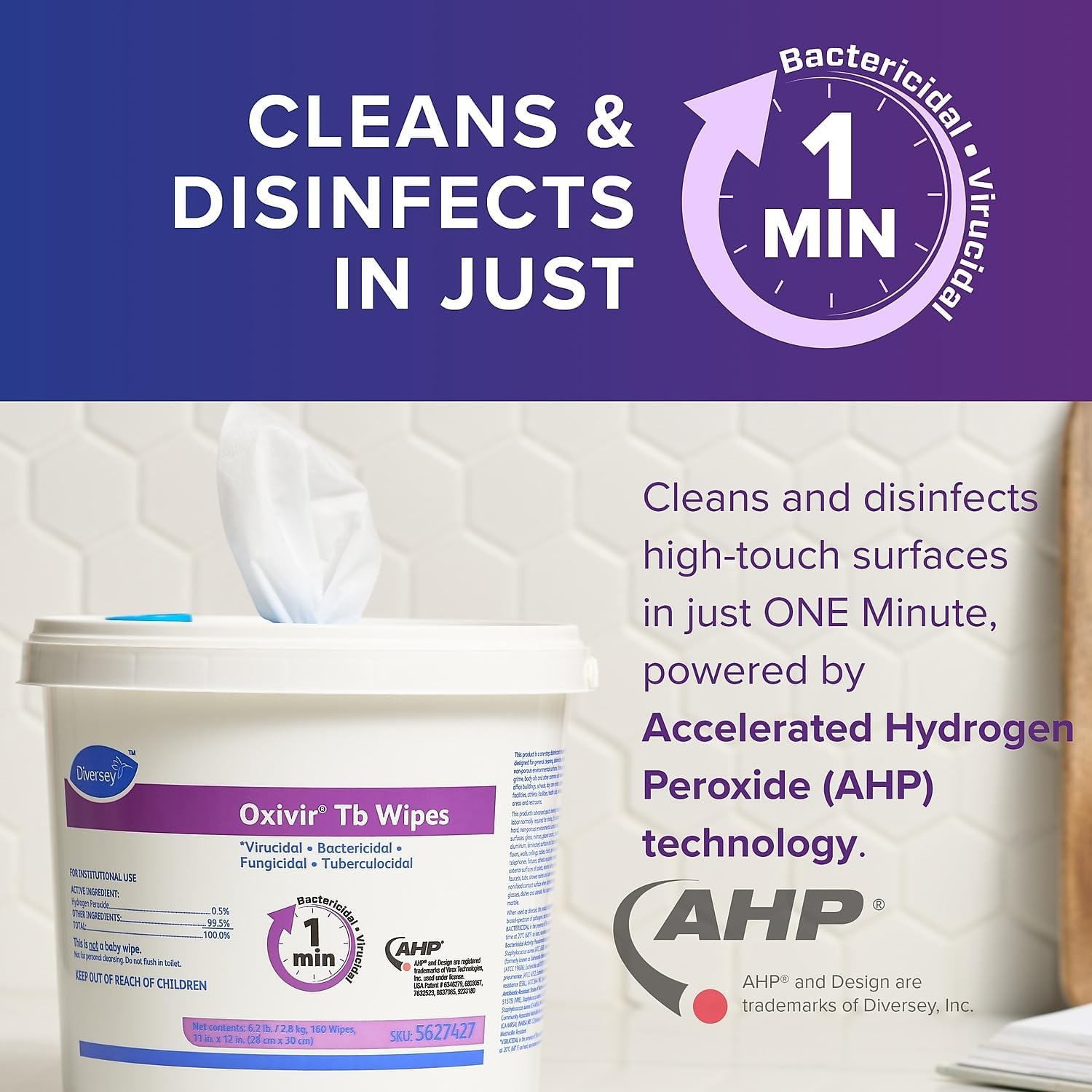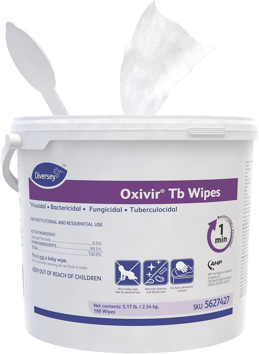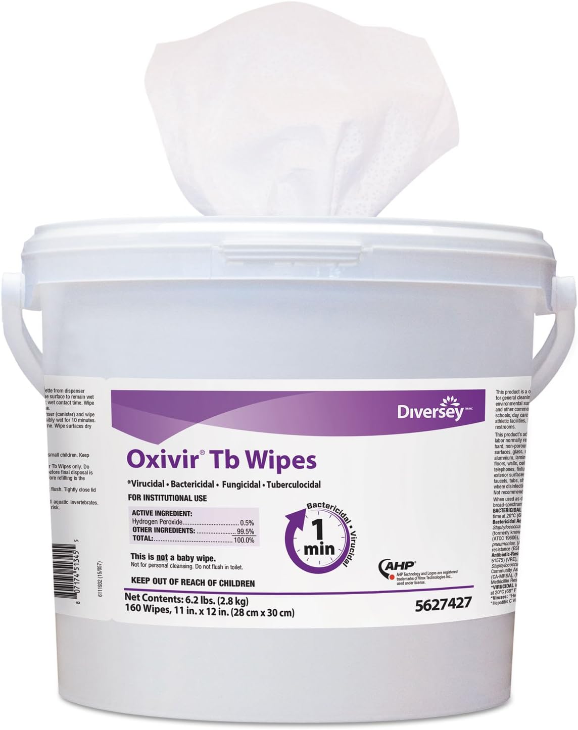 DIVERSEY 5627427 refers to a case containing 4 buckets of Oxivir TB Disinfectant Wipes. Each bucket contains 160 white wipes, with each wipe measuring 11 inches by 12 inches. These unscented wipes are a convenient and effective one-step disinfectant cleaner based on Accelerated Hydrogen Peroxide (AHP) technology.