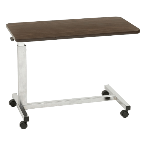With a 3.25″ frame-to-floor clearance, this overbed table by Drive Medical was designed specifically for use with low beds. A spring-loaded lift mechanism provides infinite height adjustments from 19.75″ to 28.75″. The roomy 15″ x 30″ high pressure laminate top with T-molding still provides plenty of surface area and has a weight capacity of 50 pounds. Twin 1.5″ swivel casters allow for easy maneuverability.