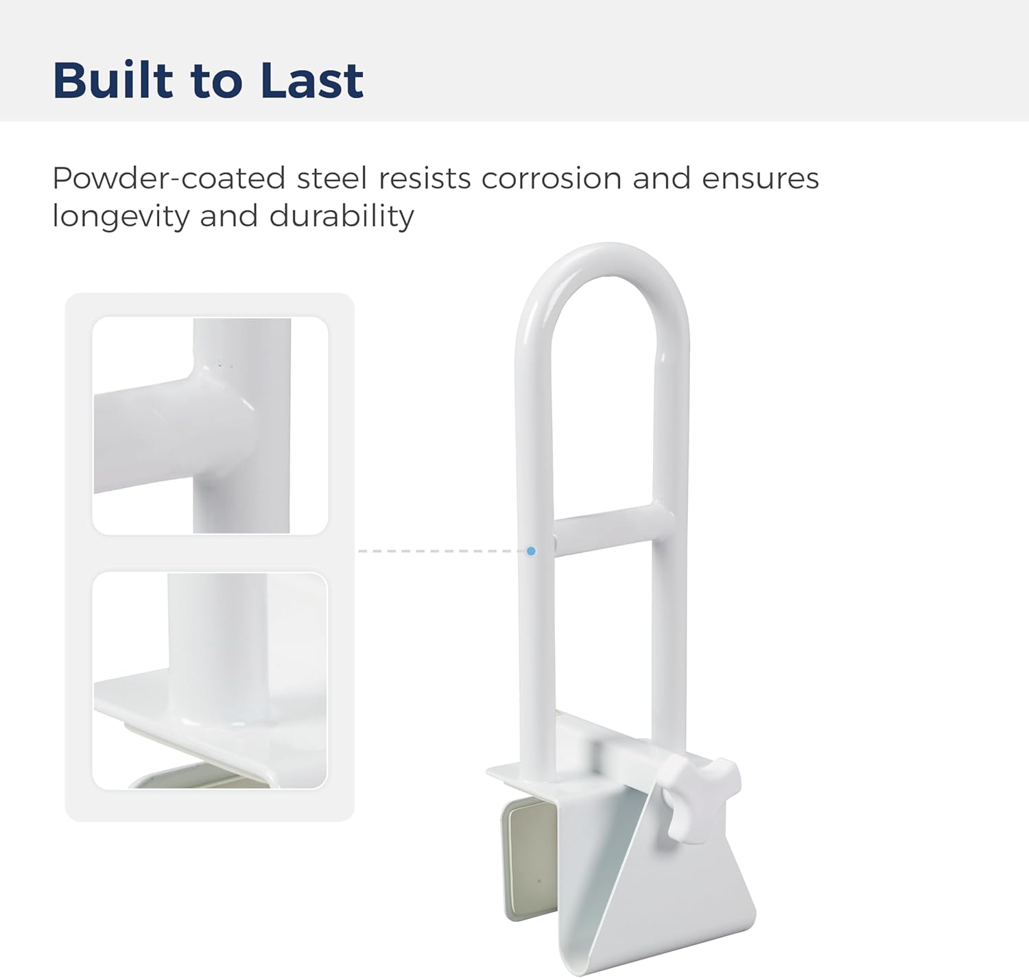 The Drive Medical L12036ADJ is an adjustable, clamp-on bathtub grab bar made of powder-coated steel, offering support and safety for bathing. It is designed for easy, tool-free installation and fits most bathtub styles (excluding fiberglass).
