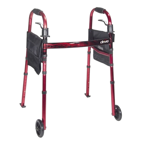 The Drive Medical Portable Folding Walker in red easily folds, tool free, to half the size of a traditional walker and can be stored in a “Ready Set Go” pouch that is provided with each walker. The legs are attached with strong elastic cords making it easy to fold flat, for easy storage and transportation. When the walker is opened, two side pouches with large pockets for personal items are held in place by hook-and-loop fastener straps to both side frames. The 5″ front wheels and rear glide skis provide a smooth transportation over most surfaces.