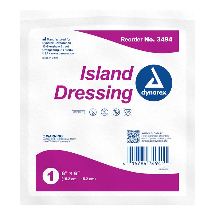 The Dynarex 3494 Island Dressing is a highly absorbent, non-stick dressing pad designed for use as a cover dressing after packing large, deep wounds. It provides a moist wound healing environment and protects the wound from contamination.