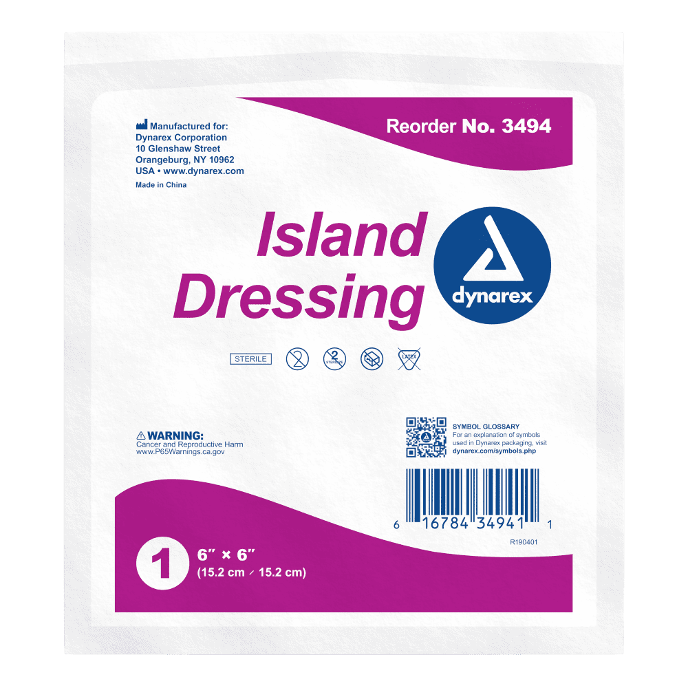 Dynarex 3494 Island Dressing Sterile—6″ x 6″ size, hypoallergenic backing, ideal for medical professionals and caregivers.