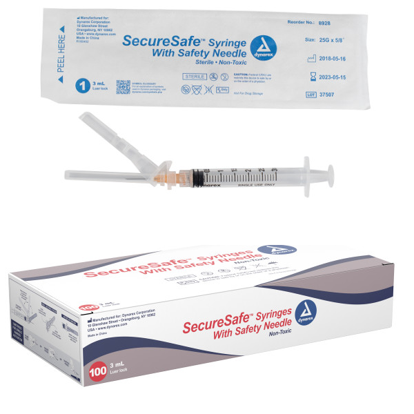 Dynarex 8928 SecureSafe Syringe w/ Safety Needle – Luer Lock, 25G, 5/8″ Needle, 3 cc, 8/100/cs