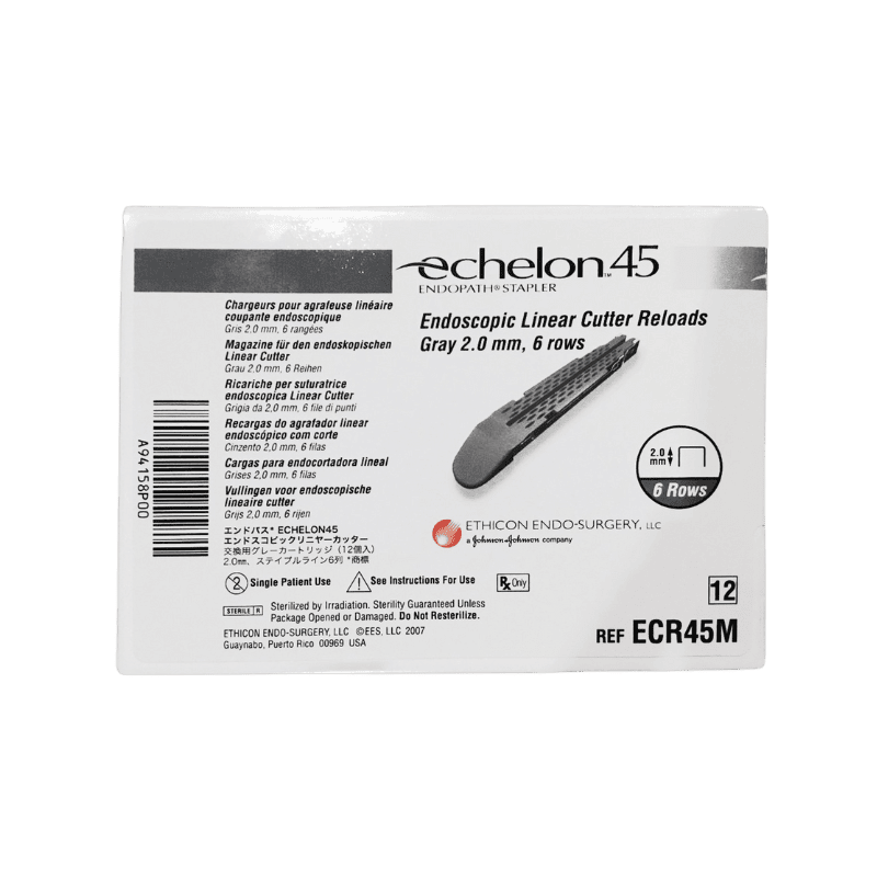 The ETHICON ECR45M is a sterile, single-use reload for the ECHELON ENDOPATH™ 45mm Endoscopic Linear Cutter Stapler. Designed for use in minimally invasive surgeries, this reload features 6 rows of staples with a 2.0mm open staple height and a 0.75mm closed staple height, making it suitable for thin tissues such as mesentery. The gray color indicates its specific tissue compatibility and staple height.