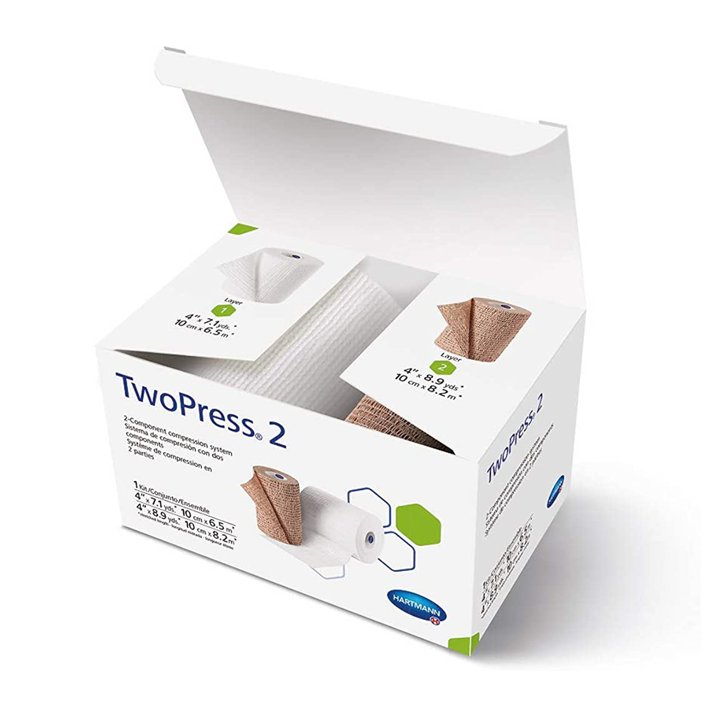 The HARTMANN TwoPress®2 Compression Bandaging System is a specialized medical bandaging solution designed for effective compression therapy in wound management. This system is intended for healthcare professionals and caregivers in clinical settings, hospitals, and home care environments. The system includes a padding bandage measuring 4″ x 7.1 yards and a compression bandage measuring 4″ x 8.9 yards, both of which are latex-free and come in a tan/white color.