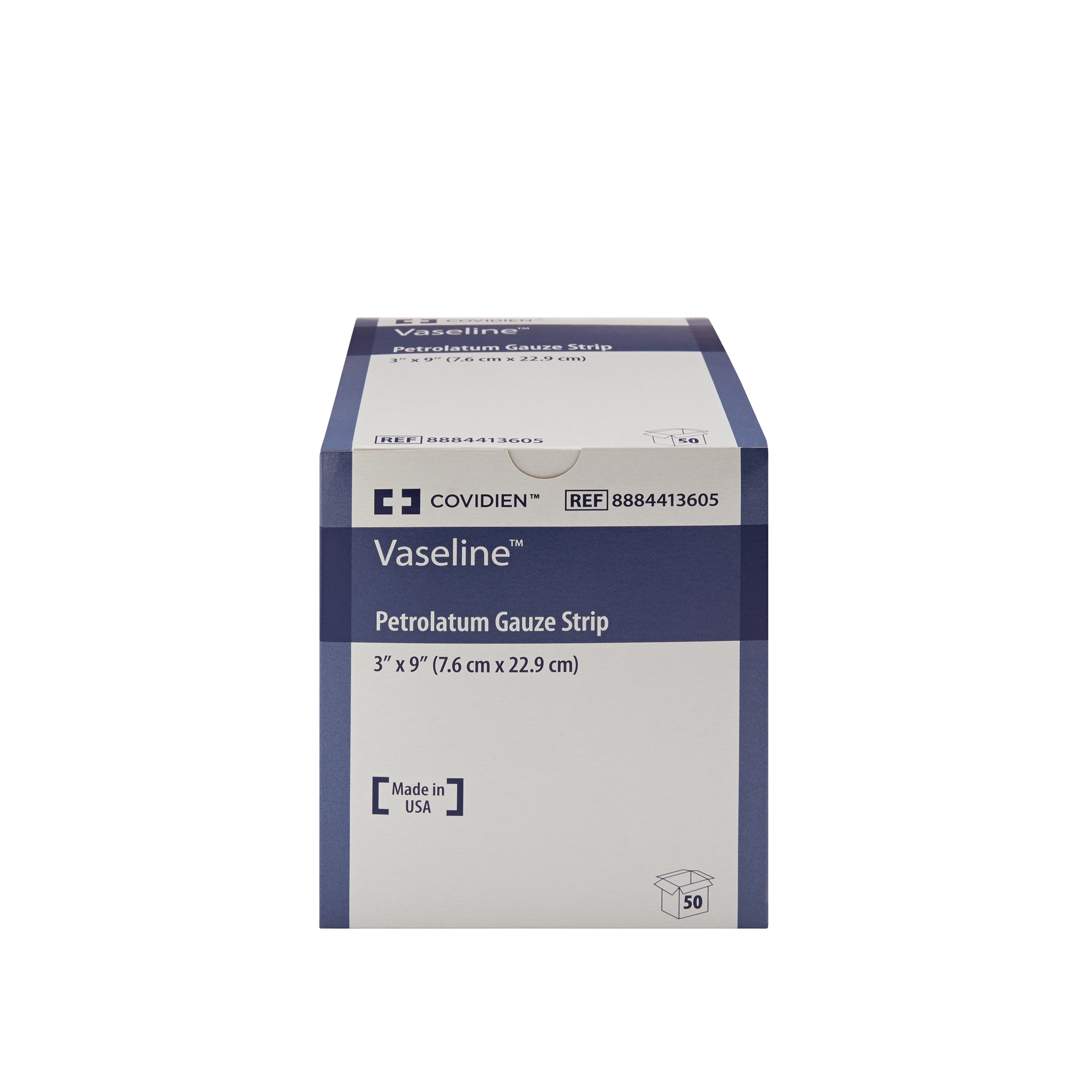 The KENDALL 413605 is a sterile, petrolatum-impregnated gauze dressing. It is a 3 inch by 9 inch rectangle. The fine mesh, absorbent gauze is impregnated with white petrolatum, creating a non-adherent dressing. This allows the gauze to cling and conform to body contours while remaining moist. The petrolatum is non-toxic, non-sensitizing, and non-irritating. The dressings are individually packaged in peelable foil packs. There are 50 dressings per box.