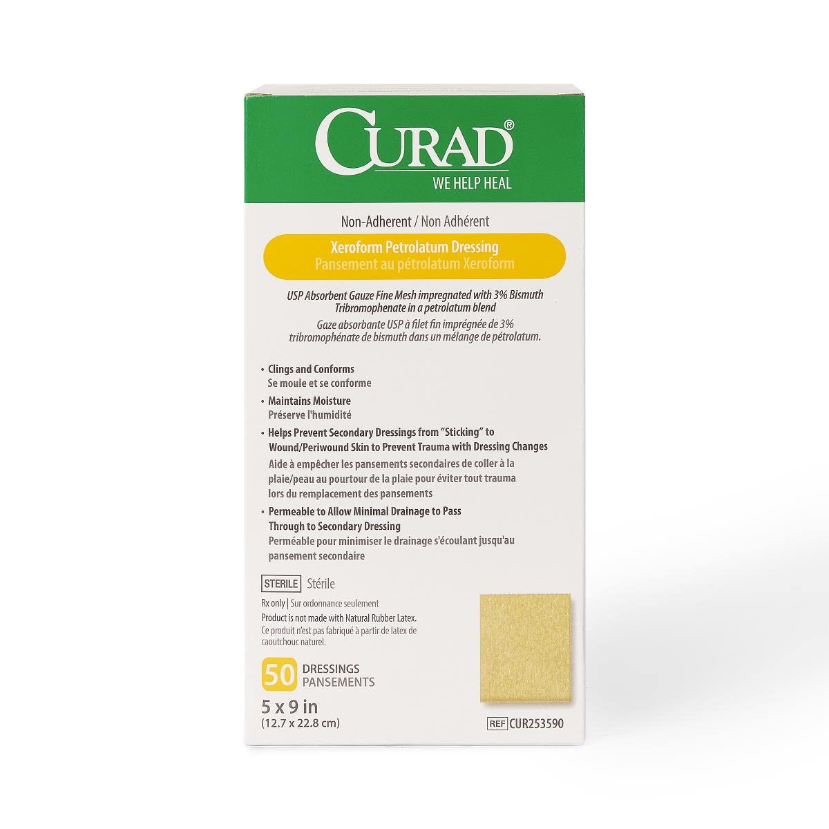 Medline Curad Sterile Latex-Free Xeroform Petrolatum Gauze Dressings (CUR253590) are designed to provide a moist wound healing environment while minimizing trauma during dressing changes.