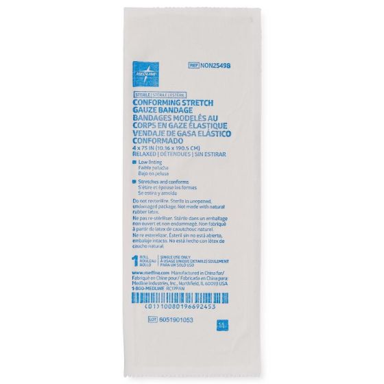 The Medline Sterile Conform Stretch Gauze Bandage (NON25498) is a sterile conforming stretch gauze bandage roll designed to gently secure to body contours, particularly in hard-to-wrap areas. Each roll measures 4 inches by 75 inches (4″x4.1 yd), and a case contains 96 total rolls, packaged as 8 boxes of 12 rolls each. These bandages are made from a one-ply rayon and polyester blend, providing one-way stretch memory that accommodates movement. Their uniquely constructed weave and finished edges are designed to prevent unraveling and lint. They are considered an ideal secondary dressing.